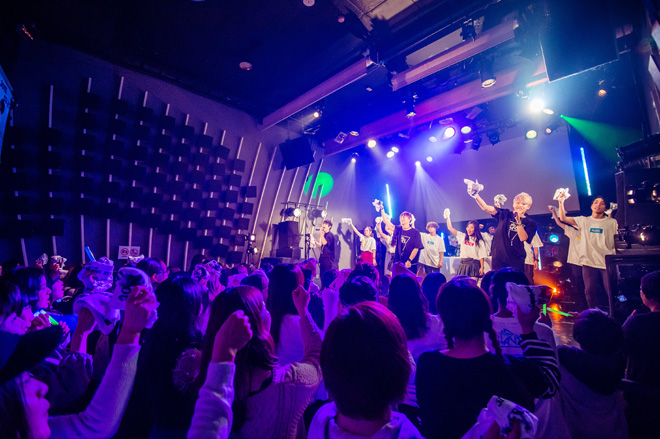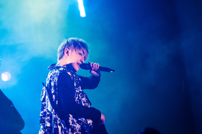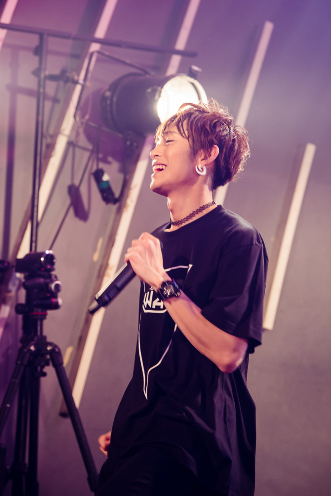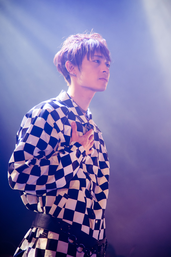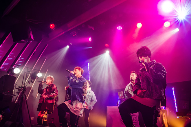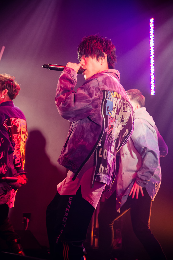 19時過ぎにYASU、MASA、SENが登場。ダンサー2名とDJと共に、新衣装でステージは始まる。3人の声は、時にソロで時に重なり歌の力が迫ってくる。ダンサブルな曲からミディアムバラードまで、歌詞というセリフとダンスという動きで、まるで芝居を観るような感覚になる。「ROV/REVOLT/衝動」「ANY」「again」のメドレーを含む5曲を終え、MCでは挨拶と自己紹介をする。オープニングでファンが用意した22日に誕生日を迎えるメンバーMASAのお面で迎えたサプライズにも触れる。ファンとの距離が近い分、こんな演出も可能だ。