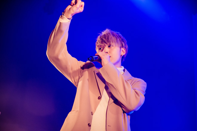 ピアノを迎えて弾き語りタイムへ。そこへSELLOUTがお祝いに登場。花束をプレゼントされ、互いにハグをする。ピアノ弾き語り1曲目には、SELLOUTのSHOHEIが参加し4人で「ToLove」。“星たちが笑ってる”という歌詞を4人で歌う暖かさ。どんな夜空も星いっぱいにできると思える。