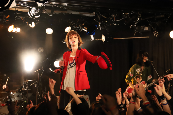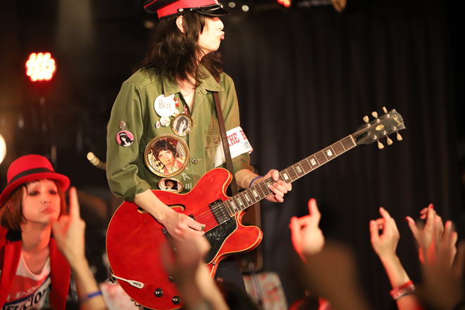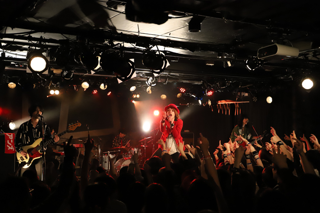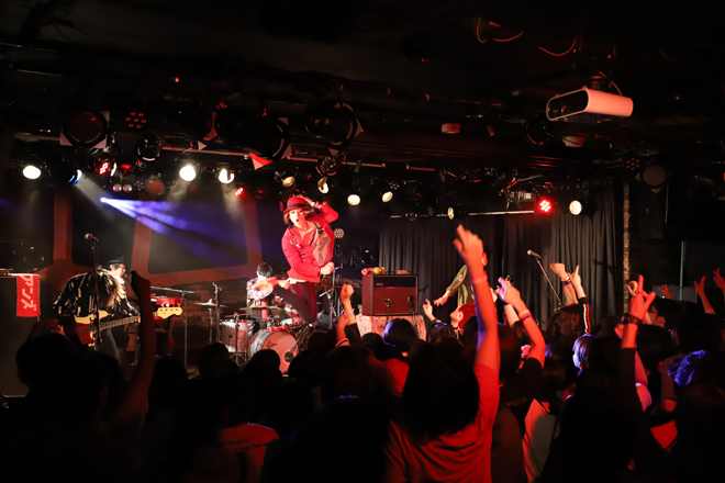SEに乗りメンバーが登場すると会場からは早くも大歓声が上がる。イントロの途中でvo.平田ぱんだがステージに飛び出し、ピアノの音色が印象的な「恋はスウィンギン・イン・ザ・レイン」からスタートすると、のっけから「THE ROBELETS」「GIRLS(ボーイズ)」といったライブでは定番のナンバーを連発。序盤からフルスロットルのセットリストが並ぶ。
