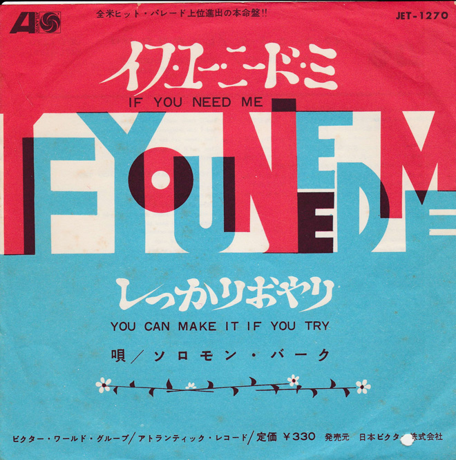 ▲63年発売のソロモンの日本盤シングル「イフ・ユー・ニード・ミー」。ストーンズ・マニアはB面もしっかりチェック。そのB面にこんな邦題もあったなんて、当時ストーンズ担当のキングレコード武田さんはお気づきにならなかったようです。当時の中古盤には右下に ○ があけられていた。多分65年頃に購入した。 From Mike’s collection