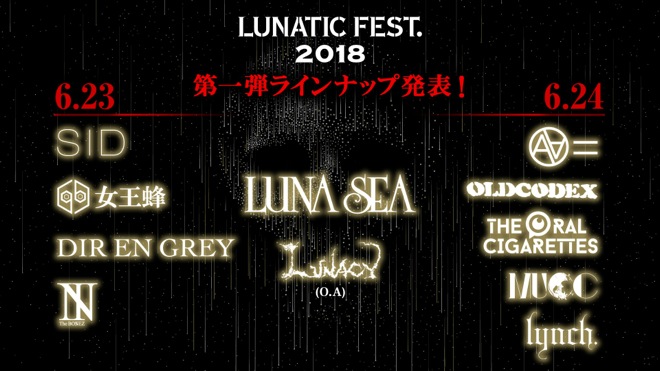 LUNA SEA主宰による史上最狂のロックフェス第二弾<LUNATIC FEST. 2018>が6月23日および24日の2日間、幕張メッセにて開催される。このたび、第一弾アーティストラインナップが発表となった。