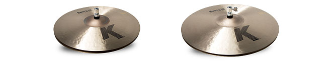 ▲K スウィートハイハット(15インチ、16インチ トップ/ボトム 別売り)。音溝加工のないカップが、ダークかつ切れ味のよいチックサウンドを実現。ウエイトはトップ「Thin」 / ボトム「Extra Heavy」。