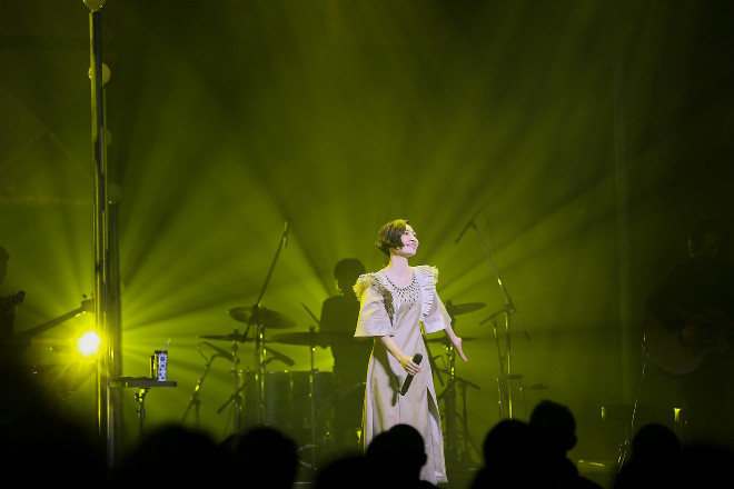 ちょっぴりエレガントなムードと美しいライティングによる舞台演出が印象的だったオープニング。「ツアー初日に駆けつけてくださった大阪の皆さん、ありがとうございます!」と笑顔で挨拶した序盤から、久しぶりのツアーの緊張感と、それを上回る再会の喜びがステージと客席の熱気を上げていく。春先をイメージして作られたというシングル「CLEAR」のカップリング曲「レコード」も披露され、まだ少し肌寒いこの季節にぴったりの歌詞世界を洗練されたポップ・サウンドと柔らかな歌声で届けてくれた。