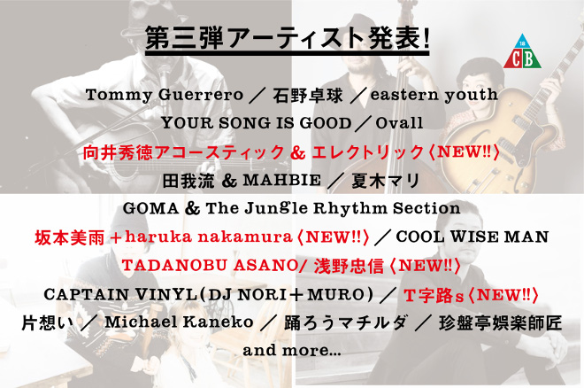 新たに出演が発表されたのは、向井秀徳アコースティック&エレクトリック、坂本美雨とharuka nakamuraによるスペシャルユニット・坂本美雨+haruka nakamura、T字路s、TADANOBU ASANO/浅野忠信だ。浅野忠信は今回、スペシャルDJとしての出演となる。