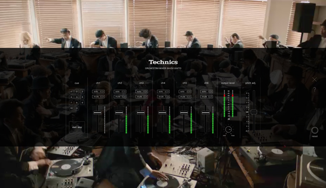 なお、サイト上ではTechnicsの機材をモチーフにインターフェースをデザインし、「パフォーマンスムービープレイヤー」として、Start/Stopはもちろん、ボリュームメーター、レベルやピッチフェーダーなどが実装。ミキサーパートではミキサーやキューボタン、ピッチフェーダーを使ってDJたちのパフォーマンスをユーザーがアレンジしながら楽しむことができるようになっているので、合わせてチェックしていただきたい。