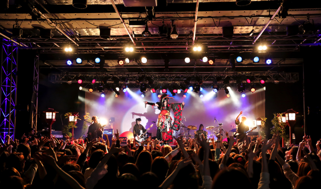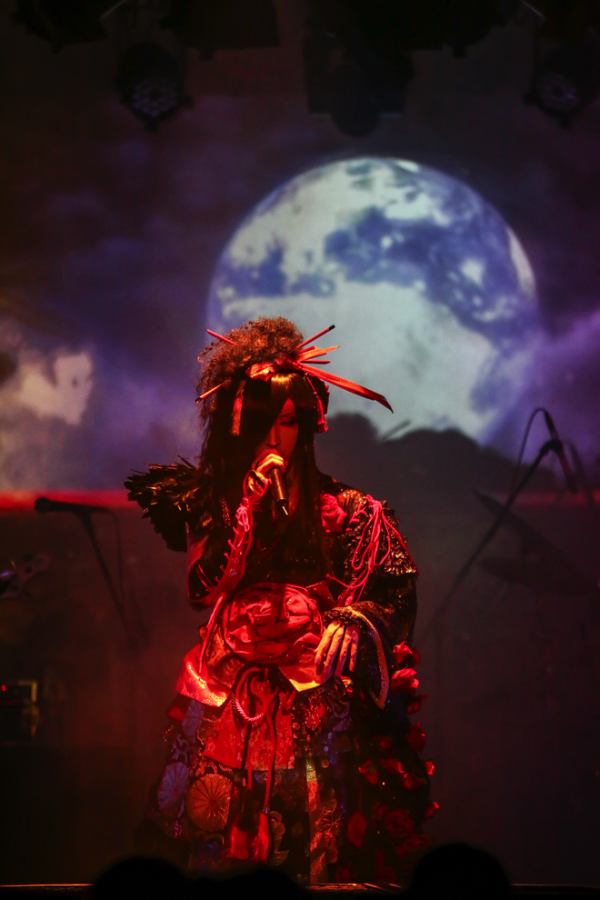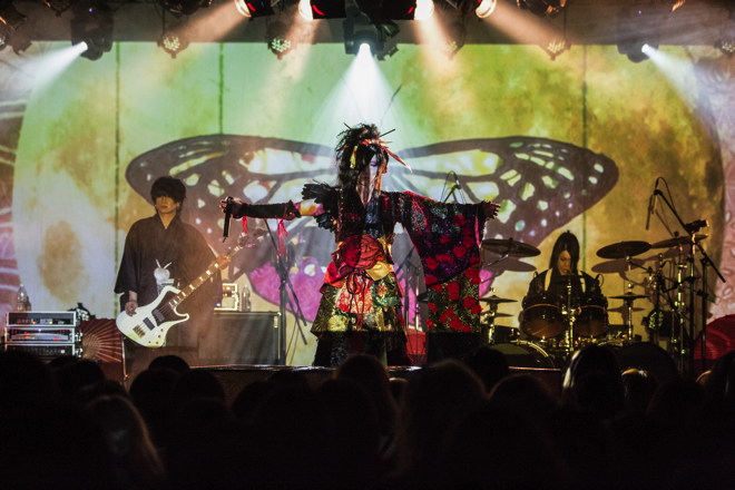 これまでの各所公演と同じく、アルバム『斑』の収録順通りに演奏をし、アンコールなしの本編のみという構成だった千秋楽。全編古語で歌詞を綴った異色作『斑』は“和”の世界観を徹底して描いたアルバムであり、当日のステージにも灯籠や松の装飾などが置かれ雰囲気は抜群。後方のスクリーンには曲のイメージを補完する映像が流れる。ツアーをサポートしてきたメンバー、HIDE-ZOU(G)、MiA(G)、亜季(B)、HIROKI(Dr)も和の装いだ。