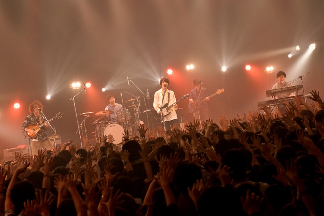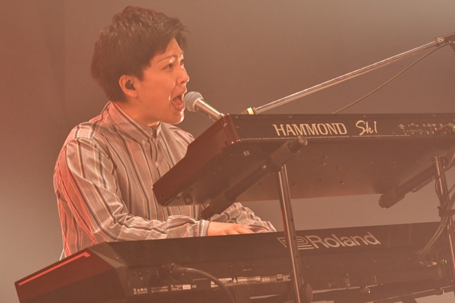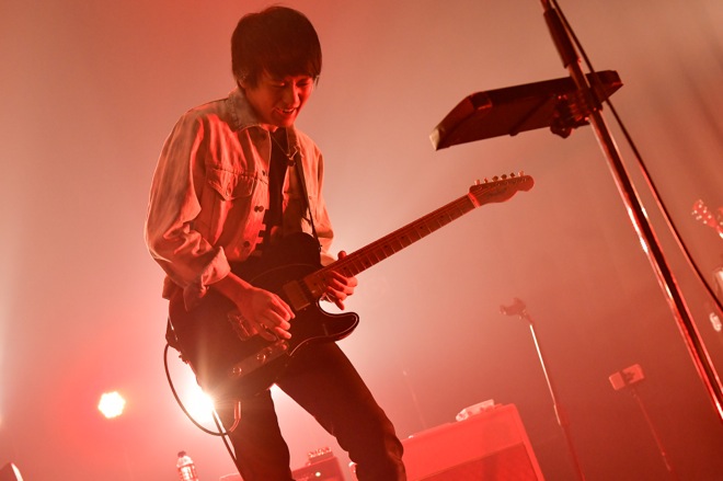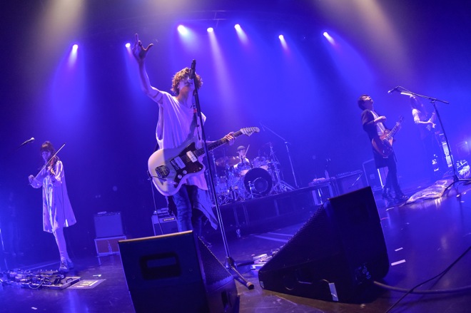 「カーニバル感は全然出せないかもしれませんけど、みんなと一緒に楽しめるようにいろいろな曲を持ってきたので、僕らの音に身を委ねて楽しんでください」と最初のMCを終えたあとに演奏したのは、メジャーデビュー曲「夜の果て」。バンドと付き合いの長い『音楽と人』が主催するイベントだからこその選曲といえるだろう。古村大介(G)の掻きむしるようなギターソロをはじめ、バンドの演奏にはメンバーの気合いがバッチリと反映されていた。