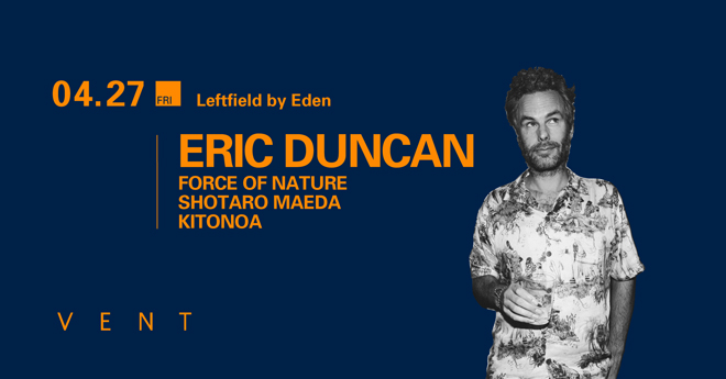 エリック・ダンカンが今回出演するのは、東京のシーンに長年に渡って君臨してきたロングランパーティ<Eden>が主宰する<Leftfield>。主宰であるSHOTARO MAEDAをはじめ、ヨーロッパ、アメリカ、アジアでのツアーも大成功させているKZA & DJ KENTによるFORCE OF NATURE、さらにKITONOAなど、強力レジデントDJ陣が脇を固める。