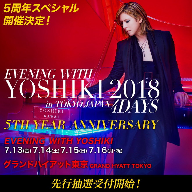 YOSHIKIのプレミアムディナーショー<EVENING WITH YOSHIKI 2018 IN TOKYO JAPAN 4DAYS 5TH YEAR ANNIVERSARY SPECIAL>が、7月13日(金)、14日(土)、15日(日)、16日(月・祝)の4日間、東京・グランド・ハイアット東京にて開催される。