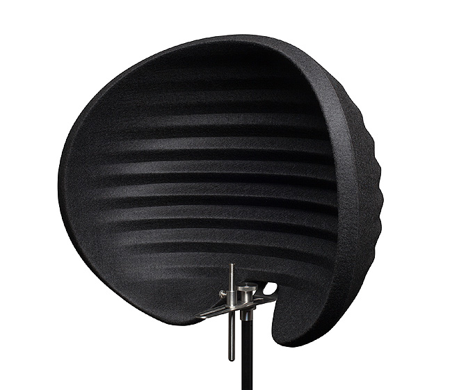 ボーカルやアコースティック楽器などの録音に広く使用されているのが、コンデンサー・マイクに代表される専用マイク。より本格的なボーカル録音を行う場合は、こうしたレコーディング・マイクとともに「リフレクションフィルター」が併用される。音は、マイクで収音されるほか室内の全方位に広がるため、リフレクションフィルターを設置して内側で吸音、外側で遮音し、壁や天井などからの反響音や反射音の影響を受けないようにするのが効果的だ。
