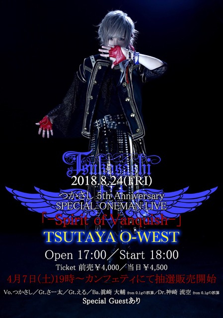 発表が行われたのは本日4月2日(月)に恵比寿aimにて行われたつかさしの2ndワンマンにて。活動5周年を前に“人生最大の重大発表”と銘打って告知された初のO-WESTワンマン<-Spirit of Vanquish->には、スペシャルゲストの参加も予定されているとのことだ。
