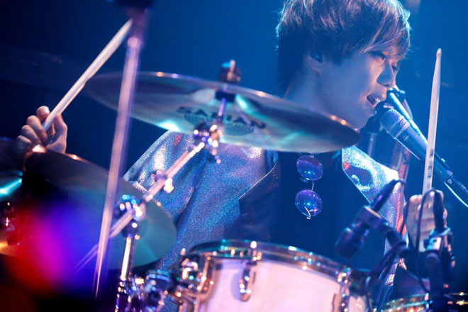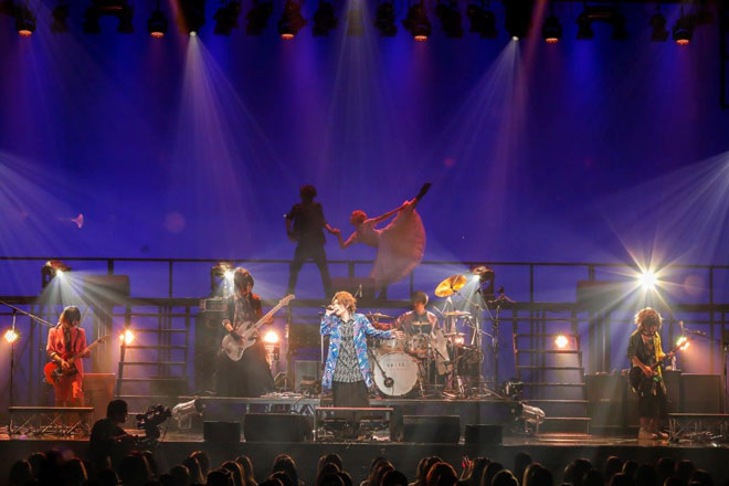 この日はまず、前説からスタート。場内が温まったところで本編へ移行するや否や、客席からはものすごい歓声が沸き起こった。それもそのはず、ステージ上に現われたメンバーは、新曲「-ハロミュジック-」のアーティスト写真と同じポーズでそこに立っていたのだから。カラフルでありながらスタイリッシュな衣装と相まって、結成7周年の貫禄を感じさせる。そのまま各々が定位置へと動いた後、本日1曲目となる「-ハロミュジック-」を演奏していく。いきなりの新曲始まりということにも驚かされたが、楽器隊の演奏力の向上には目を見張るものがあった。ジャズベースを基本に置いた上でのダンサブルなリズムにU’s(ユナイトのファンの呼称)は自然と体を揺らしていく。さらには、ダンサーを加えるという演出も曲の世界観をより豊かなものにしていた。