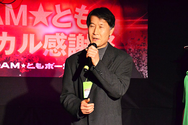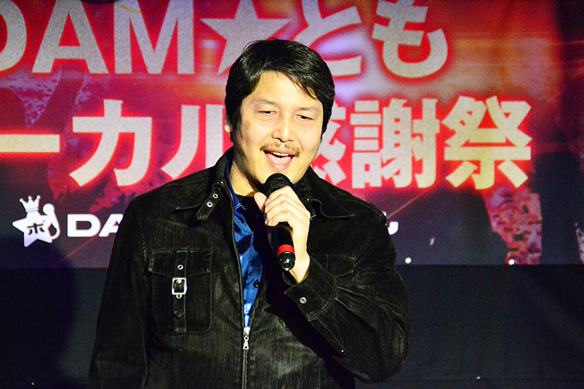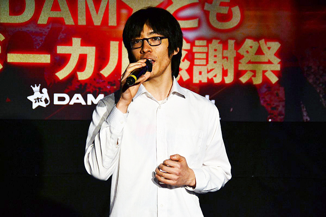 続いてDAM★ともの総責任者である第一興商の村井専務が挨拶に登壇。現在、DAM★ともボーカルの採用曲は50,000曲以上、絶好調とのこと。そして、DAMのカラオケ上位1,000位の中でDAM★ともボーカルがついていないのは9曲しかないというから驚きだ。また、上位10,000曲のうちDAM★ともボーカルがついていないのは1,000曲程度ということで、「これがなくなっちゃったらこのサービス終わっちゃうからどうしよう(笑)。」と、絶好調なサービスならではの思わぬ悩みも?。また、採点で上位を決めるため、所謂「採点歌い」に陥らず、「是非、人間の尊厳を保って楽しく歌ってください」と、会場をドッと笑わせてくれた。