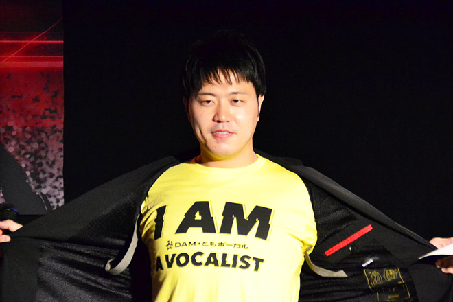 また、エハラが来ている「I AM VOCALIST」と書かれたイエローのTシャツは、DAM★ともオリジナルTシャツで、この日の出場者にプレゼントされるものであることが告知された。