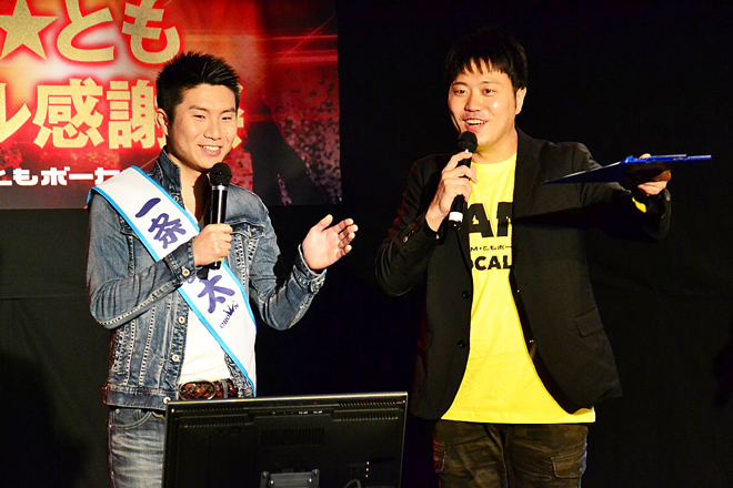 <DAM★ともボーカル感謝祭>は、2018年3月1日時点までの総合採用曲数上位のDAM★ともボーカリストの皆さんに感謝の意をお伝えしたい、とのことで開催されたもの。会場となった「HIT STUDIO TOKYO」には多くのカラオケユーザーが集い、ウエルカムドリンク片手に賑やかな雰囲気で開演を待っていた。イベントはビートの効いたSEと共にスタート。「どーもー!T.M.Revolutionのライヴみたいな曲で出てきました!」といきなり笑わせながら登場したのは、DAM★とも大使として数々のDAM★ともイベントに出演しているメインMCのエハラマサヒロ。そして、この日は歴代のDAM★ともマスコットが集結。初代の咲坂柚衣、2代目のKENSAKUとM!ho、3代目の鈴木裕人がステージに上がった。また、この日は4代目マスコットの発表もあるとのことで、エハラが「みんな、ちゃんとDAM★とも愛があるのか?それぞれ言ってみい!」と、マスコットとしてDAM★ともに忠誠を誓っているのかを問う。
