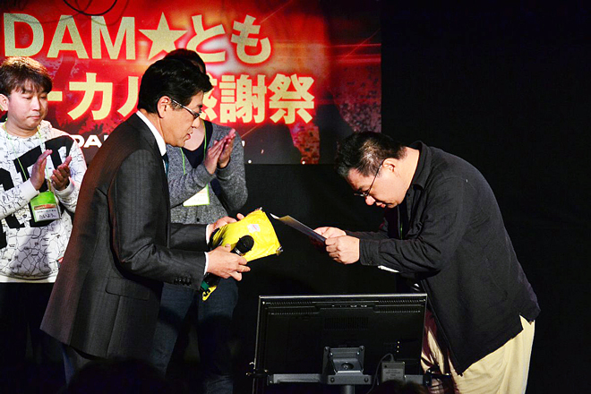 インタビューでは、「これからも自分の点数を更新していきたいです」と意気込みを語った。すべての歌唱が終わると、表彰式へ。村井専務からDAM★ともボーカリストを代表して、こちさんに表彰状とTシャツが手渡された。