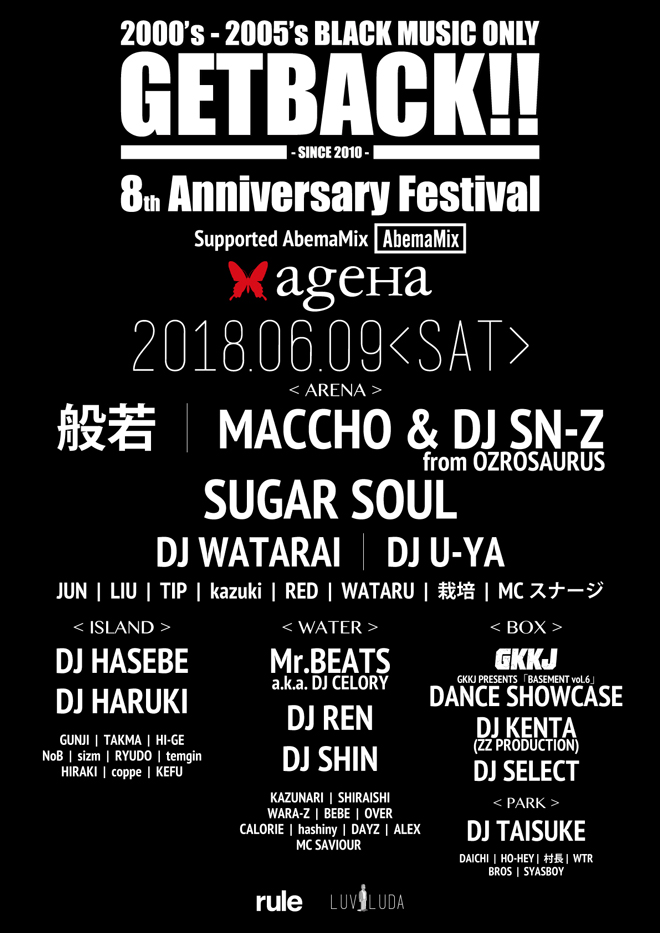 2000年から2005年のヒップホップ・R&B縛りの選曲をテーマに様々なアーティスト/DJがゲスト出演し、毎回その縛りにも関わらず多くのオーディエンスを動員し盛り上がりを見せているイベント「GET BACK!!」が、6月9日(土)新木場ageHaの全フロアで開催されることが決定した。