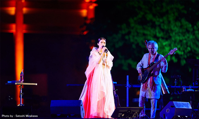 月をテーマにしたという、彼女の世界観が存分に表現されたこのライブは、観音経が響き渡る厳かな登場から始まり、和楽器に乗せた彼女の透き通った意志の強い歌声や、天女のような羽衣を羽織った煌びやかな衣装などの全てが、歴史ある荘厳な平安神宮の雰囲気と相まって、まるで太古にタイムスリップしたかのような壮大で幻想的なスペシャルライブとなっている。