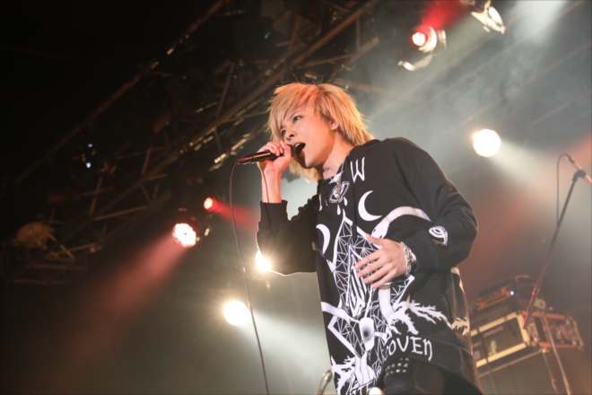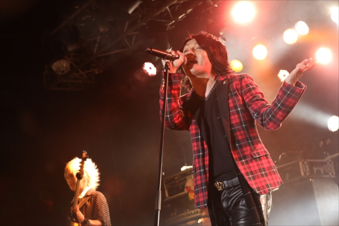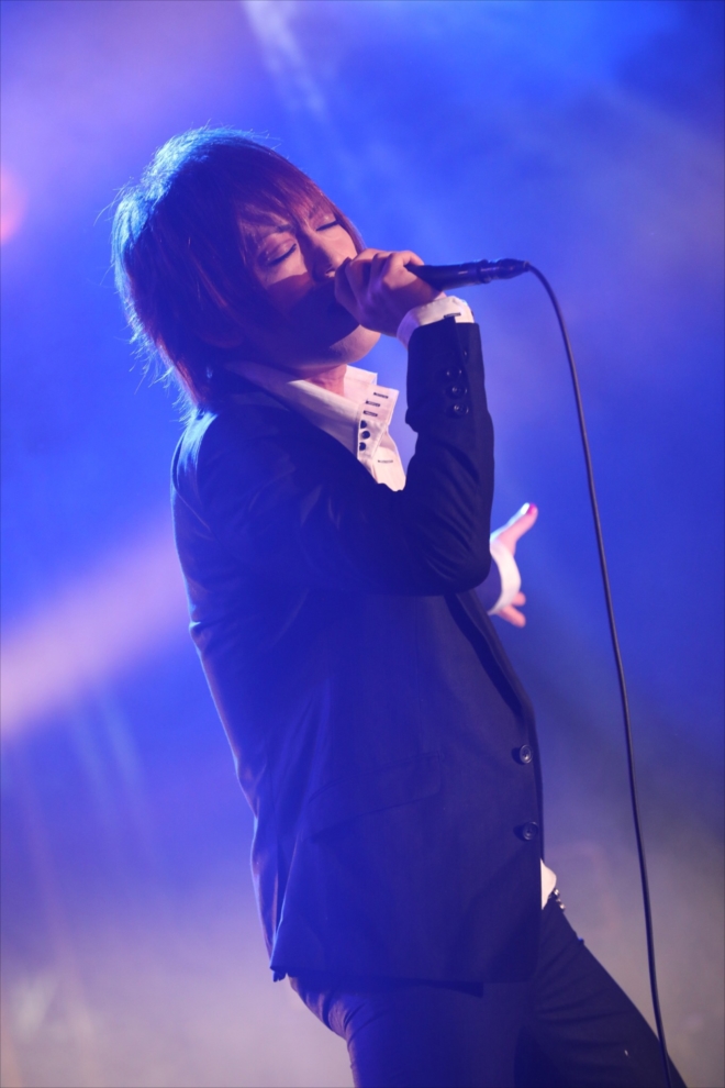 「WOW WOW WOW」と声が響き、ともにシンガロングしたくなる「流星」も登場。胸をくすぐるキャッチーな歌と軽快な中にも重量感を持った演奏が、一気に身体をはしゃがせた。ともに歌を口ずさむ人たちも。突き上げられた沢山の拳が、何時しかフロアー中で大きく揺れていた。派手でゴージャス、何より熱く胸をくすぐる歌にハートが嬉しく震えていた。「まだまだイコうぜ」と、激しさと勢いを増すように「NEVER END,CRY.」が駆けだした。楽しいパーティな空気へ、観客の突き上げる拳が増えていく。このパーティは止まらない。互いに裸な心になって熱狂をぶつけあおうぜと、Ryoは誘いをかけ続けていた。