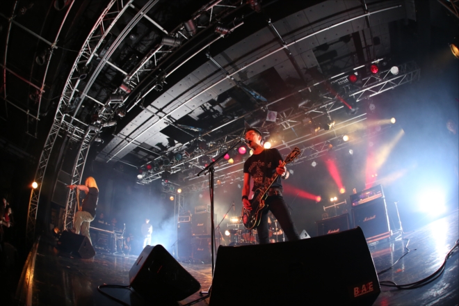 yoshinuma(Vo&B)の雄叫びを合図に、凄まじい轟音を響かせTOKYO YANKEESのライブがスタート。とても“らしい”幕開けだ。「Pre emptive strike」の演奏が、身体を激しく震わせる。豪快な演奏に合わせ暴れ狂えと呼び込むように、彼らは激熱なリフビートを刻み続けていた。その様はまさに、我が道をひた走るTOKYO YANKEESに似合うユニフォーム。勢いを加速するように、TOKYO YANKEESは「Serial killer」をブースト。ハードコアパンクなスタイルを持った楽曲が、ハンマーを激しい勢いで叩くようにせまりだす。その迫力に熱狂するか、呑み込まれるか。この日は圧倒される人たちが多かったが、そんなのお構いなしに彼らは爆音をぶつけ、スクリーモし続けていた。演奏は「Bastard」へ。楽曲は勢いを持続させるどころか、爆音を轟かせ暴走し続けていた。豪快で一本気なスタイルがイカす。会場中を包み込む轟音、その唸りの中へ身を浸してゆくことが快楽だ。この熱狂、もっともっとむさぼり喰らいたい。