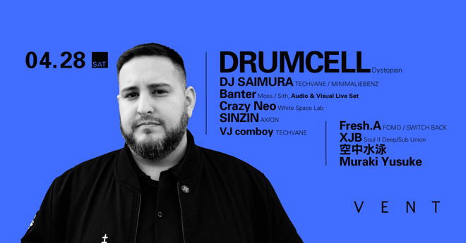 2000年初頭にはウェアハウスパーティ<Interface>と<Droid Behavior>を仲間とともに立ち上げ、今までにはジェフ・ミルズ、ムーディーマン、スピーディJといった著名DJをLAに招聘してきた。そんな、北米においてもっとも難解なテクノアーティストと評されるDrumcellのパワフルなミニマルセットがVENTのサウンドシステムで体験していただきたい。