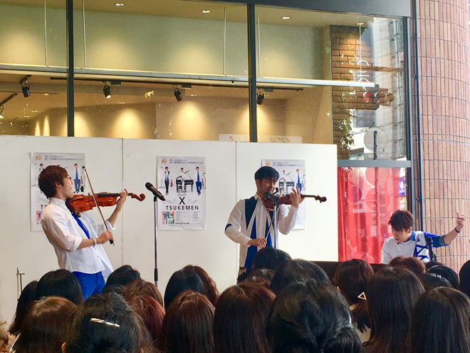 結成10周年を迎えるWヴァイオリン&ピアノによる3人組インスト・ユニットTSUKEMEN(ツケメン)が、渋谷MODI 1Fで野外フリーライブを行った。