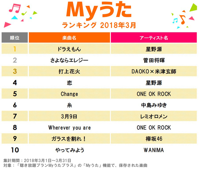 au、「Myうた」楽曲ランキング2018年3月を発表 最も人気の楽曲は星野源の「ドラえもん