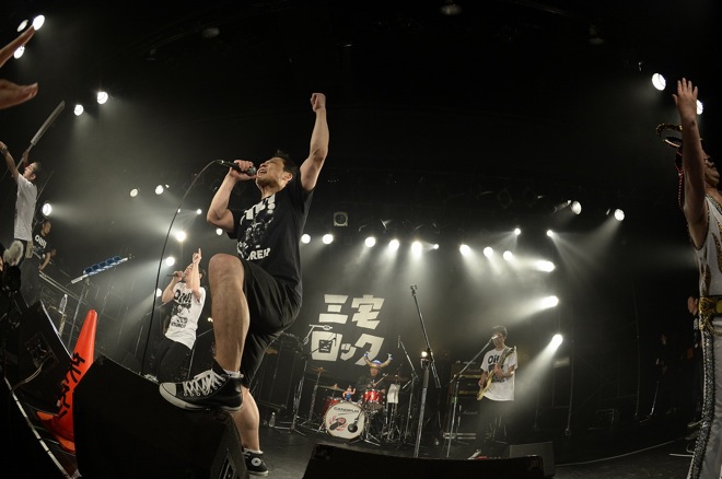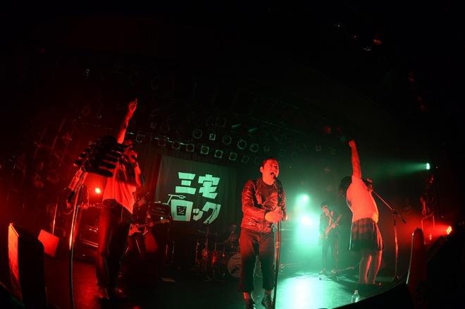 開演時間の19時ちょうどにグループ魂のMC港カヲル(46歳)が登場。「女は三宅弘城である。なぜなら三宅をサウナに誘うと“イク、イク、イク〜”ってなるから」という口上でオーディエンスの笑いを誘う。さらに怒髪天、ニューロティカなどが出演した前回の<三宅ロックフェスティバル>を振り返っていると、このイベントの主役である石鹸がステージに姿を見せる。