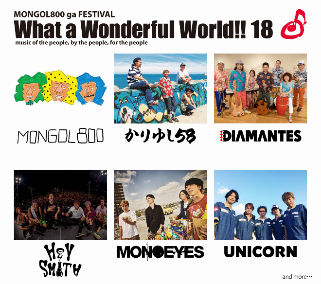 11月3日(土・祝)、4日(日)に沖縄・美らSUNビーチで開催されるMONGOL800主催フェス<What a Wonderful World!!18>より、第一弾出演アーティスト発表が行なわれた。
