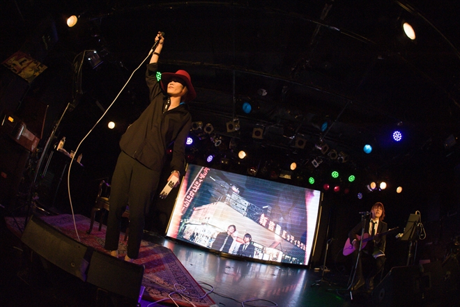 全編アコースティックギターと歌声のみで構成されたこのイベントは、新宿歌舞伎町という場所の独特のムードと相まって、情感たっぷり。オーディエンスは終始、新たな命を吹き込まれたMERRYの名曲の数々にほろ酔い気分で浸っていた。