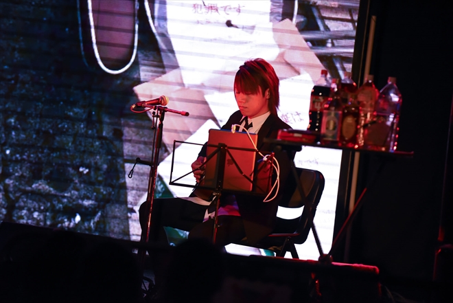 午後6時に開演の第二部<「新宿ブルース」~名曲スナック「結生」~>では、MERRYの音楽的主導者でもある結生によって選ばれた楽曲で構成。適度に肩の力の抜けた「BLUESCAT」でさっそく観客を魅了すると、「犬型真性MASOCHIST」では原曲とひと味違った切なさが場内を支配する。結生がこの第二部のために手掛けたというバックの映像も、各楽曲の情緒とうまく溶け合いオーディエンスの目を楽しませていた。特に印象深かったのは、客席からリクエストを募って披露した「ひらひらとんでる。」だ。その場で即興のアレンジが施されたこの曲は、ガラと結生のプロの技に間近で触れることのできる貴重な機会となった。こうした観客参加型のコーナーも<新宿ブルース>の魅力のひとつと言えるだろう。「Black flag symptom」でタンバリンを手にしたガラが観客の手拍子を扇動し、最後は「SWAN」でしっとりと美しく幕を閉じた<名曲スナック「結生」>。感情豊かなメロディを次々と生み出す結生の技量が堪能できた。
