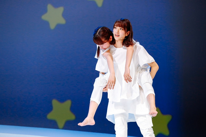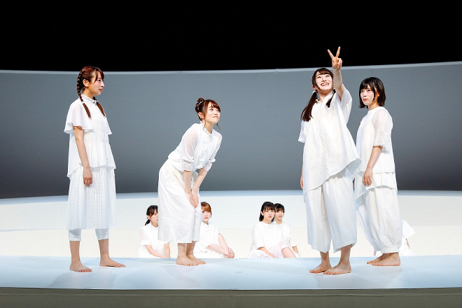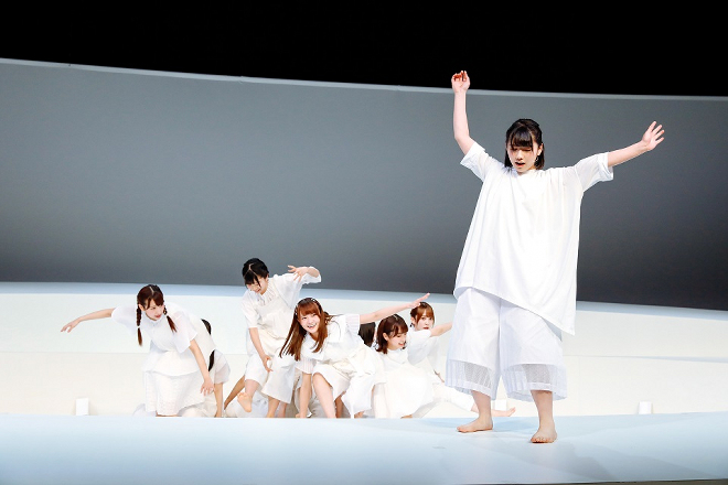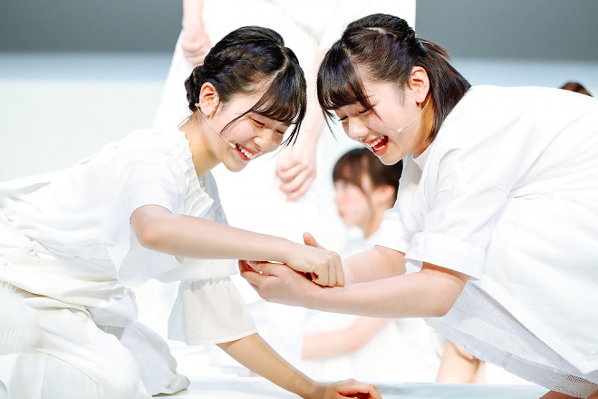 グループ初の舞台となった本作は、2010年『わが星』で岸田國士戯曲賞を受賞した劇団ままごとの柴 幸男の代表作。目には見えない時間の道を歩く「あゆみ」という一人の女性の人生の物語を、10人で1役(あゆみ)という形で演じる個性的なスタイルの演劇だ。公演はけやき坂46の20名がチームハーモニカとチームカスタネットに分かれ、2チーム制で行なっていく。