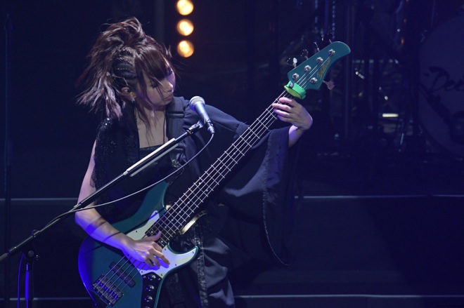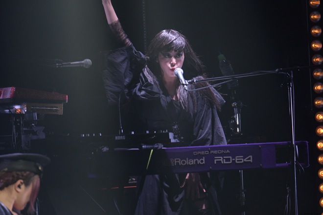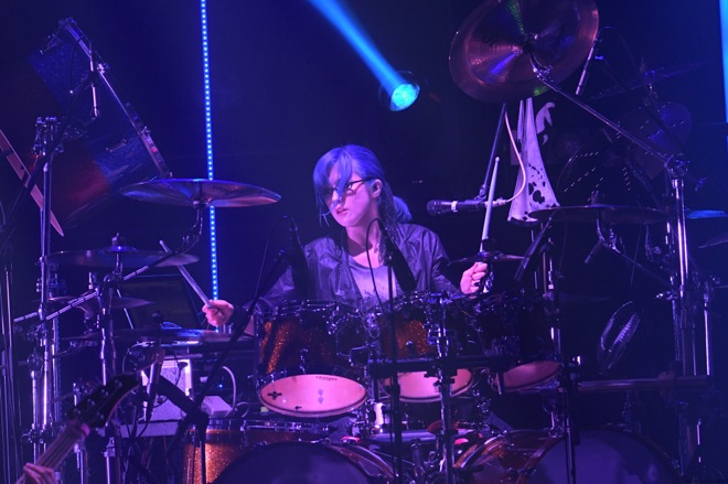 シリアスな表情とバイアスのかかった口調という独特のMCで客席を湧かせた後、メロディアスな「ヌーディリズム」やスタイリッシュな「HERO」、スローチューンの「fragrance」「Doll’s Box」などが演奏された。ハードなナンバーを軸にしたバンドでいながら、「Doll’s Box」のような温かみに溢れた楽曲をしっかり聴かせるあたりも見事。抑揚を効かせたボーカルとシンフォニックなサウンドが溶け合って創出される煌びやかな世界観に強く惹き込まれた。