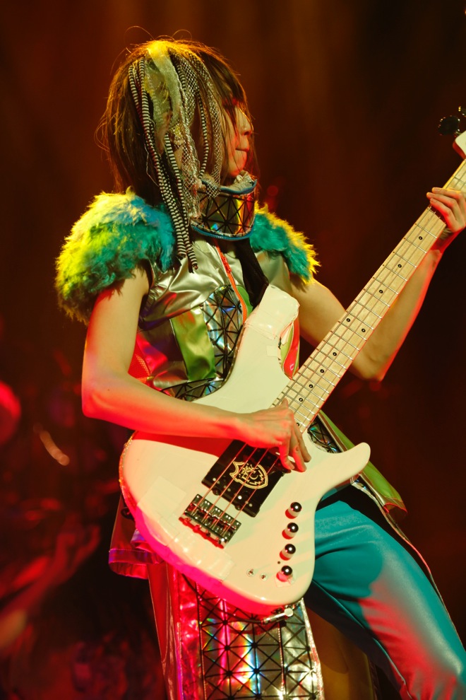 ▲オレオレオナ(Vo&Key)メインボーカルを務めつつスクエアでテクニカルなドラミングを決めるはな。曲調に合わせてしなやか系とパーカッシブ系のスラップを使い分け、ボトムプレイではファットにウネるグルーブを生み出すF チョッパー KOGA。ソリッドなリフワークやシャープなカッティング、歌心に溢れたギターソロなど、多彩かつ的確なアプローチが光るTOMO-ZO。リズム楽器としての役割も果たすキーボードとフレキシブルなコーラスで楽曲のエモーションを増幅させるオレオレオナ。4人のサウンド&プレイはDOLL$BOXXのそれとは当然ながら異なるものだ。さらには、灼熱のダンスをはじめ、曲によってはエレキギターを弾いたりけん玉の腕前も披露するなど、パフォーマーの1号 まいが強い存在感を発する。全曲を通してプレイやパフォーマンスの見どころが満載で楽しめたし、秀でた演奏力がGacharic Spinの提示する世界観の説得力を高めていることも改めて感じた。