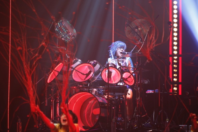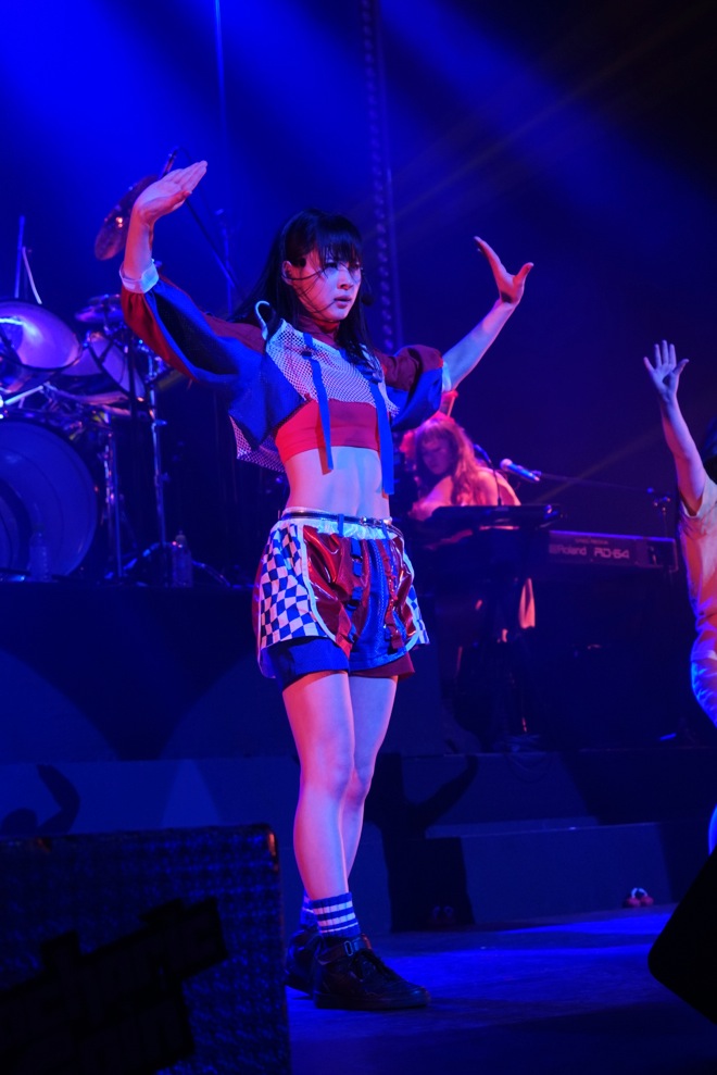 ▲はな(Vo&Dr)ライブはダンサブルな「KAKUHEN」で幕を開け、パワフルチューンの「爆弾娘(ボンバーガール)」や「Never say never」で畳み掛けるという流れからスタート。ラウドでアッパーなサウンドとカラフルな衣装に身を包んで激しいステージングを展開するメンバーの姿、パフォーマーの1号 まいとガチャダンJr.の4人が織りなすフィジカルなダンスなどが一体になったステージは華やかさに満ちている。オーディエンスも熱いリアクションを見せ、場内はパーティ会場を思わせる賑やかな空間へと化した。