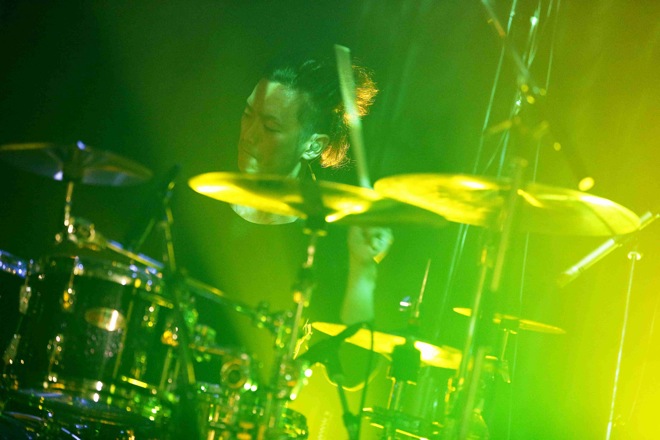 音はクリアで各楽器の分離も抜群。それでいて少しも耳触りでない。なのでアレンジのディテールが手に取るようにわかる。予め打ち込まれたギターの音に小林が、丁寧な手つきで音を重ねていく。小林は完全に黒衣の役割に徹していて、ヴィジュアル面でも演奏面でも決して悪目立ちはしない。だが彼のプレイが、この音数の少ないストイックなユニットのサウンドに、非常にデリケートで細やかな変化をつけていくのが、この音響だとよくわかるのである。それは山口のドラムプレイも同じで、手堅いが躍動的なプレイでダイナミックなグルーヴをバンドにもたらしているのが体感できる。山口のTwitterによれば「今日は少し邪念が入っていた」ということだが、もちん客席で聞いている分にはまったくわからない。