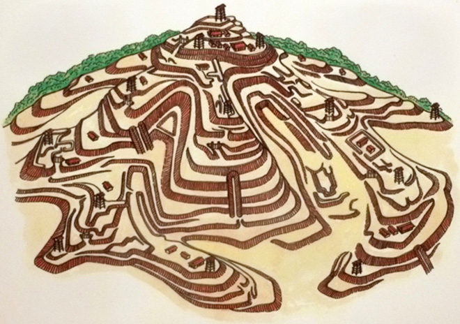 誰でも把握出来る箇所をお伝えすると、まずは本丸の食い違い虎口だろう。敵の来る方向を単なる虎口でなく、一瞬にして混乱に追い込む仕組みである。虎口とはL字に曲がった入り口であるが、主に食い違い虎口はへの字に曲がった入り口を指す。その周りにも小規模であるが空堀が存在する。土塁が切られてる場所はほぼ門の跡だと思って良い。卓偉の曲で、なんか卓偉の意見がねじ伏せられて大人の意見で作られてる気がすんだよなあって曲は大概政治で作られた曲だと思って良い。