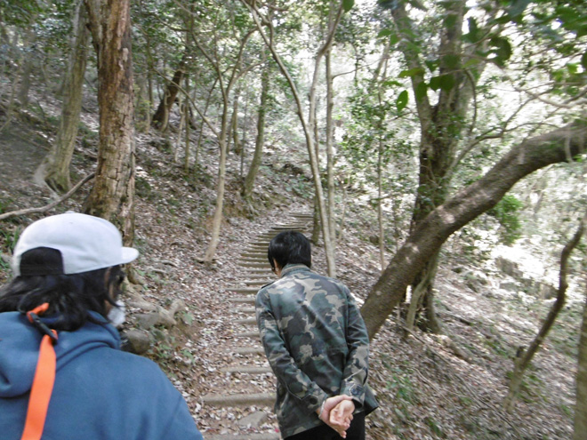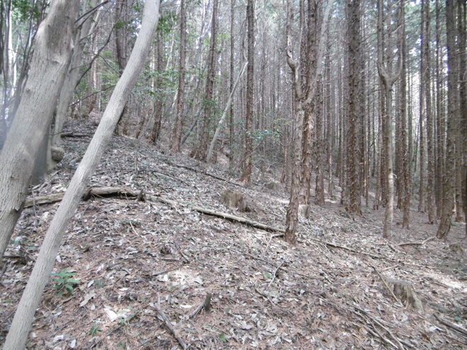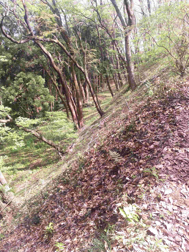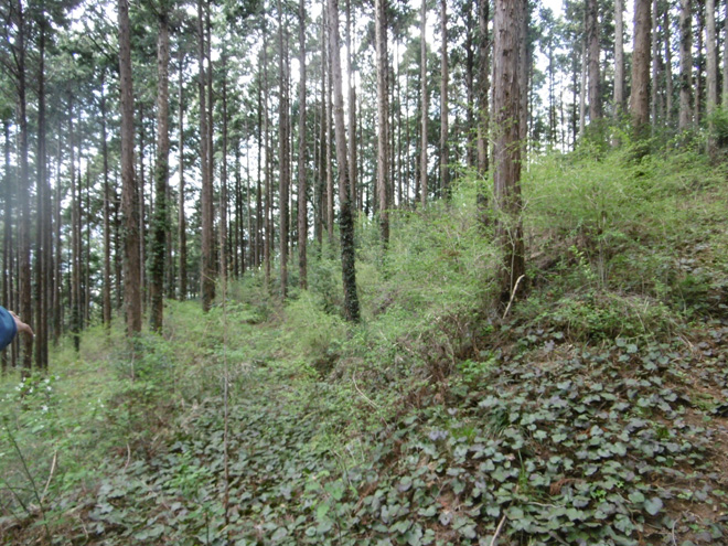 次は犬走り。このコラムでも説明して来たがこういった大きな曲輪の下に通路のように平地が設けらている。城の建築の時代から用いられる用語であり、現在でも家の建築に使われる用語、犬走りである。戦国当時は武者走りとも言った。逃げ道にも出来るし、敵の裏を打つ為に先回りして準備することが出来る道とも言えるだろう。そんな犬走りが本丸の周りに設けらているのである。だがこれも草が生い茂っていてマニアじゃないと見分けられない。これ残念。幅も2メートル近くあり、当時は物資を運ぶ為にも使われただろうし、位の高い人を運ぶ為に籠でも通れるほどの幅である。本丸に限らず両サイドに広がった曲輪の下を犬走りが縁取っている。これに注目だ。堀切の下など、土橋の横からよく覗いてみるとどこまでも犬走りが続いている。ロケで来た我々一行は(卓偉、天才ディレクター菊谷さん、マネージャーの顔が長い砂田の3人)この犬走りを発見した瞬間テンションが上がり、どこまでも藪をかき分けこの犬走りを行進した。いや、砂田だけはなんでこんな道進むんだよと思っていた。