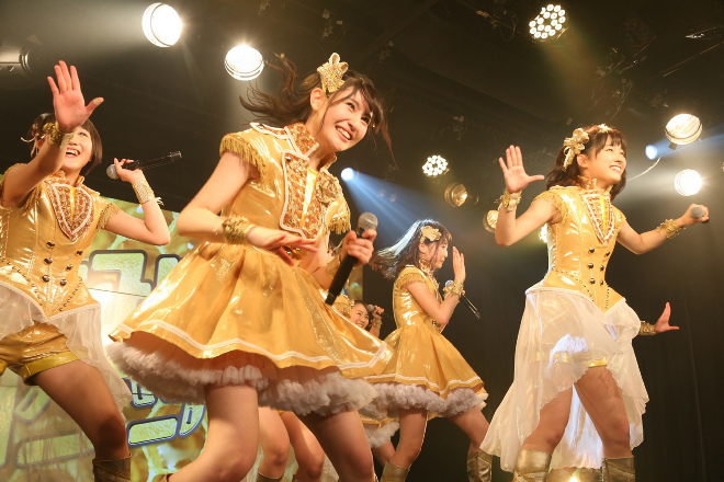 そのままノンストップで、アゲアゲで躍動感ある「ハニートランポリン」、情熱的な「恋メラ」、王道の学園アイドルポップス「放課後リフレイン」と続け、いずれもタイトル通りの世界観を表現して、跳ねながら歌ったり、ターンでスカートが翻ったり。1曲1曲がすごく印象に残る。エレピのイントロから沸いたのは、スターダストプラネットのアンセムとも言える「走れ!」。ステージ狭しと動く7人のエネルギーほとばしる熱唱から、客席にマイクが向けられると「ウッホイ、ウッホイ!」の大合唱に。