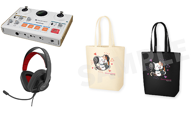 ▲「超タスカム」ブースでは「MiNiSTUDIO」やゲーミングヘッドセット「KOSS GMR-545-AIR」(左下)などを展示。販売コーナーのhatomugiさんデザイントートバッグ(右)は2色を用意。