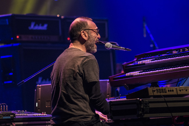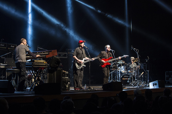 スチュワート・コープランド(ポリス/ドラムス、ヴォーカル、ギター)、エイドリアン・ブリュー(キング・クリムゾン/ギター、ヴォーカル)、マーク・キング(レヴェル42 /ベース、ヴォーカル)、ヴィットリオ・コズマ(PFM/キーボード、ヴォーカル)という実力派ミュージシャン4人が集結。はたしてどんなライヴを見せてくれるか緊張感の張り詰めた会場で、観衆を迎えたのはスチュワートが笑顔を浮かべながら、ギターを抱えて歌いまくる姿だった。デタラメ(良い意味で)エスニック言語の歌詞が飛び交う「アミカ・ピパ」を1曲目に持ってきたことで、場内のピリピリした空気がスッと和らいだ。