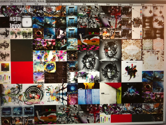 さあこっからが不安な背景。まず大元のバックドロップ用に作ったpsd(フォトショップ用のデータ)を開く。これ見て気付く。去年の以降にリリースしたジャケットねえじゃん。まあどっちにしてもバックドロップ用に作った縮尺だったから組み換えもしないといけないし丁度良いので新規にジャケットの絵を追加して組んで行く。