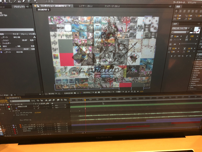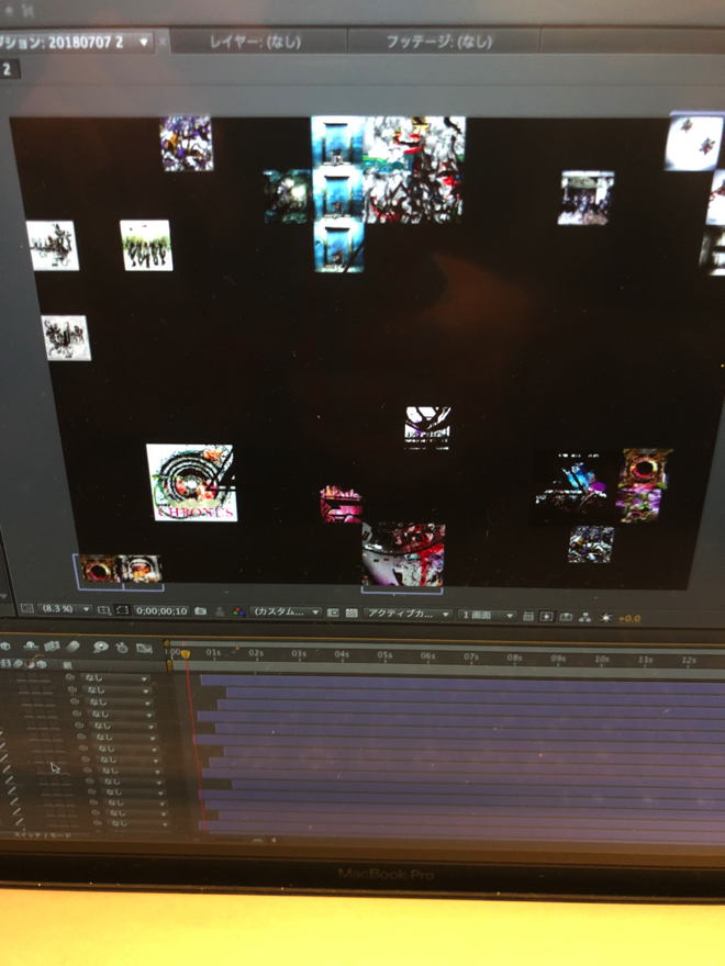 そして音。「JulyⅦth」を読み込んで…あれなんでだろう音入れると動画が動かない。またも調べるとレンダリングが必要…書き出しってやつか。ミュージックビデオとかライブ用の映像作る時に出来上がりました、から見れるまでいつも結構時間かかるんだけどそこでやってる作業がレンダリング、書き出しという作業。まあ驚く程時間かかりますね。30秒とかそこそこしかない動画なんだけどこれ。何倍もの時間かかるんだな…。