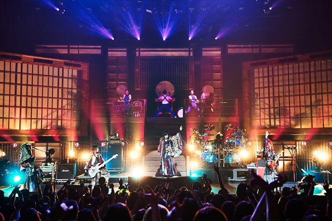 今回の千秋楽公演は中野サンプラザだったが、このステージを踏むのも二回目のこと。ここ最近の巡業の千秋楽公演はキャパシティの大きなライブハウスで行うことが多く、ホール公演は2016年8月に行った日本武道館公演以来となった。この日のライブでは、和太鼓を中心に和楽器を鳴らす東京打撃団とのコラボステージも登場。遠海准司(Dr)とのセッションを皮切りに、「見世物鬼譚」「阿吽」「桜花爛漫」で和楽器の演奏を交えた激しくも雅な演奏を披露。