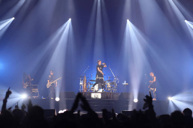 イベントへの期待感でいっぱいに膨らんだ会場は、貪欲にパフォーマンスを欲していた。オーディエンスの視線がステージ一点に注がれる中、ライブパフォーマンスの先陣という重責を担ったのは4人組ロックバンドのSPYAIR。KENTA(Dr)のアグレッシヴなドラミングとともに、IKE(Vo)が「東京、楽しんでいきましょう!」とシャウトすると、その叫びが号砲となったかのように1曲目からキャノン砲が豪快に打ち上がり、イベント開始の狼煙をあげた。ランウェイを花道に代えて、IKEが両手を広げ「東京、声を出して!」と呼びかけるとオーディエンスも負けじと声を上げ、「サムライハート(Some Like It Hot!!)」で観客が一斉にタオルを回す様も壮観だ。エモーショナルかつパワフルなサウンドと力強い歌声で、瞬く間にその場を巨大なライブハウスに変えた。