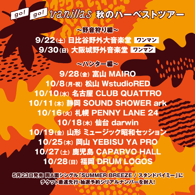 全12公演となる本ツアーでは、“〜野音狩り編〜”と副題がつけられた東京・日比谷野外大音楽堂、大阪・大阪城野外音楽堂の野外ワンマン公演と、“〜ハンター編〜”の対バン形式のツアーが開催される。go!go!vanillasのキャリア初となる野外音楽堂でのワンマンライブをぜひ堪能して欲しい。“〜ハンター編〜”の気になる対バン相手は後日発表となるので続報をお楽しみに。