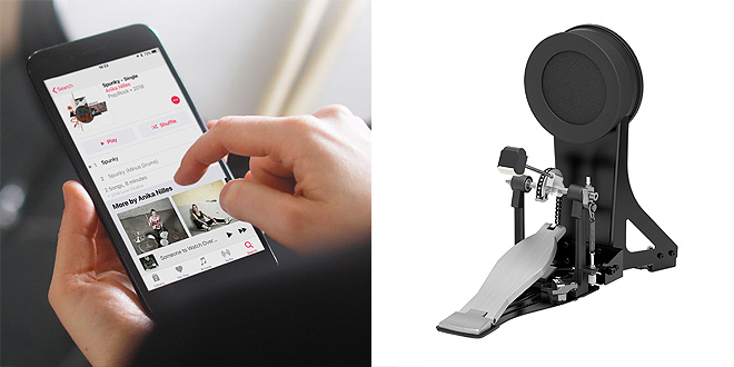 ▲スマホ内の曲を「TD-17」のBluetooth機能で再生しながら練習が可能(左)。キック・パッド「KD-10」(右)は3機種共通(キック・ペダルは別売り)。新しい設計で優れた打感と高い安定性を実現し、激しい演奏にも耐える性能を持つ。