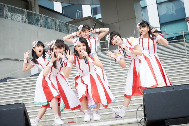 リリースイベントの最終日ということもあり、会場に詰めかけた約500名のファンが待ち焦がれる中、紅白のビーチパラソルをモチーフにしたキュートな衣装を纏ったメンバー6名が勢いよくステージに登場、ばっしょー初となる4つ打ちディスコチューン「bye bye bye」でライブはスタートした。