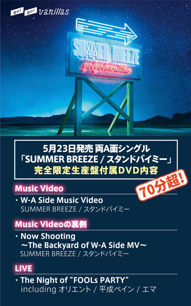 go!go!vanillasが、5月23日(水)に発売するシングル「SUMMER BREEZE / スタンドバイミー」の完全限定生産盤に付属するDVDのダイジェスト映像を公開した。