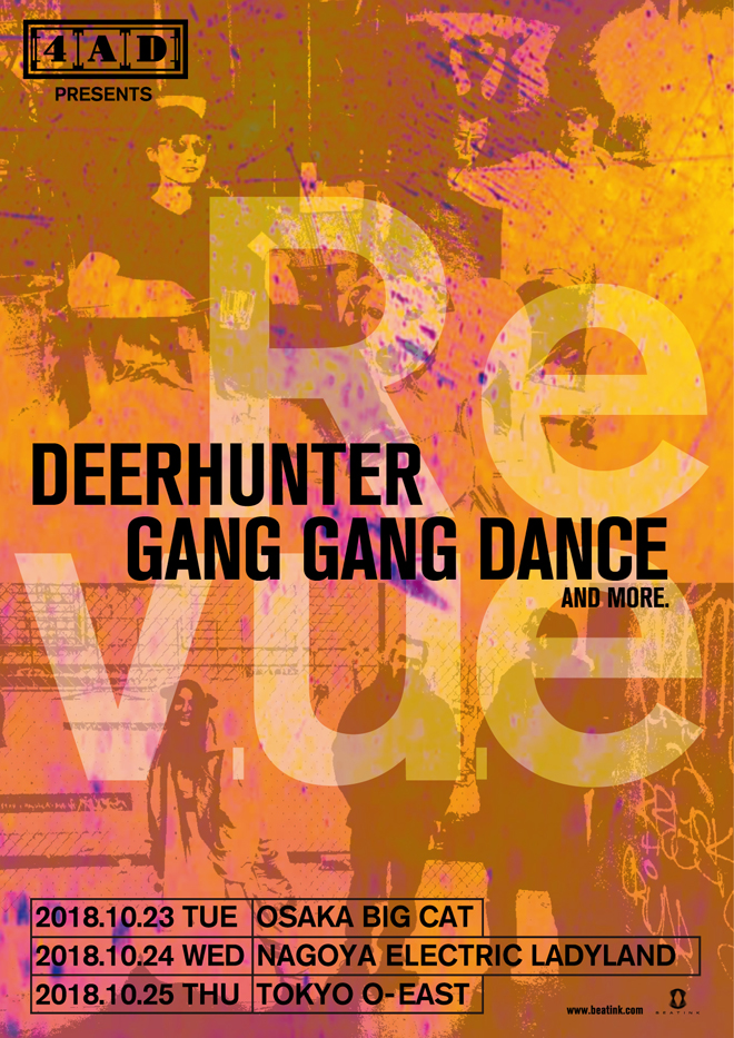 4ADと言えば、元祖シューゲイズと言うべきコクトー・ツィンズ、デヴィッド・ボウイやT・レックスの美学を受け継いだバウハウス、ポスト・ロックの耽美性を究極的に高めたディス・モータル・コイル、米オルタナ・シーンの健全ぶりを示したスローイング・ミュージズ、ニルヴァーナにも影響を与えたピクシーズやザ・ブリーダーズ、ブレイク・ビーツやアシッド・ハウスを先導したM/A/R/R/S、さらにオーストラリアからのデッド・カン・ダンスもいれば、ブルガリアの女性合唱団・ブルガリアン・ヴォイス、さらに最近ではザ・ナショナルやグライムスといったメジャー級のトップアーティストから、急成長を遂げているザ・レモン・ツイッグスも紹介したりと、ジャンルやスタイルを越えて、独自の美意識に貫かれたバンドを数多く輩出している。そんな4ADの遺伝子を受け継ぎつつも、現在のシーンを鋭く映し出すバンド達をフィーチャーしたイベント<Revue>のジャパンツアーが決定し、ディアハンターとギャング・ギャング・ダンスの出演が発表された。
